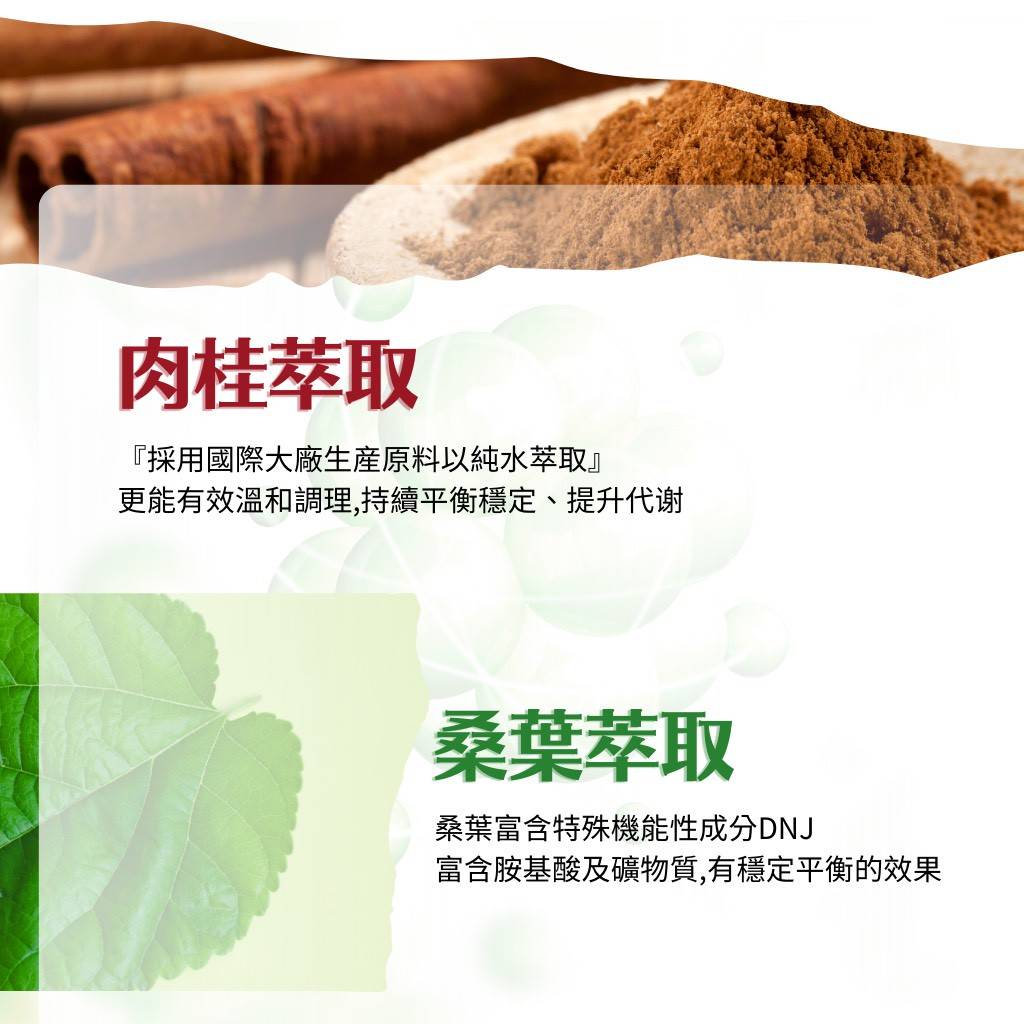 🔸 搭配桑葉、武靴葉、肉桂、綠茶、鉻酵母等多種機能植萃,成分黃金協同,幫助穩定代謝、有效平衡體質!