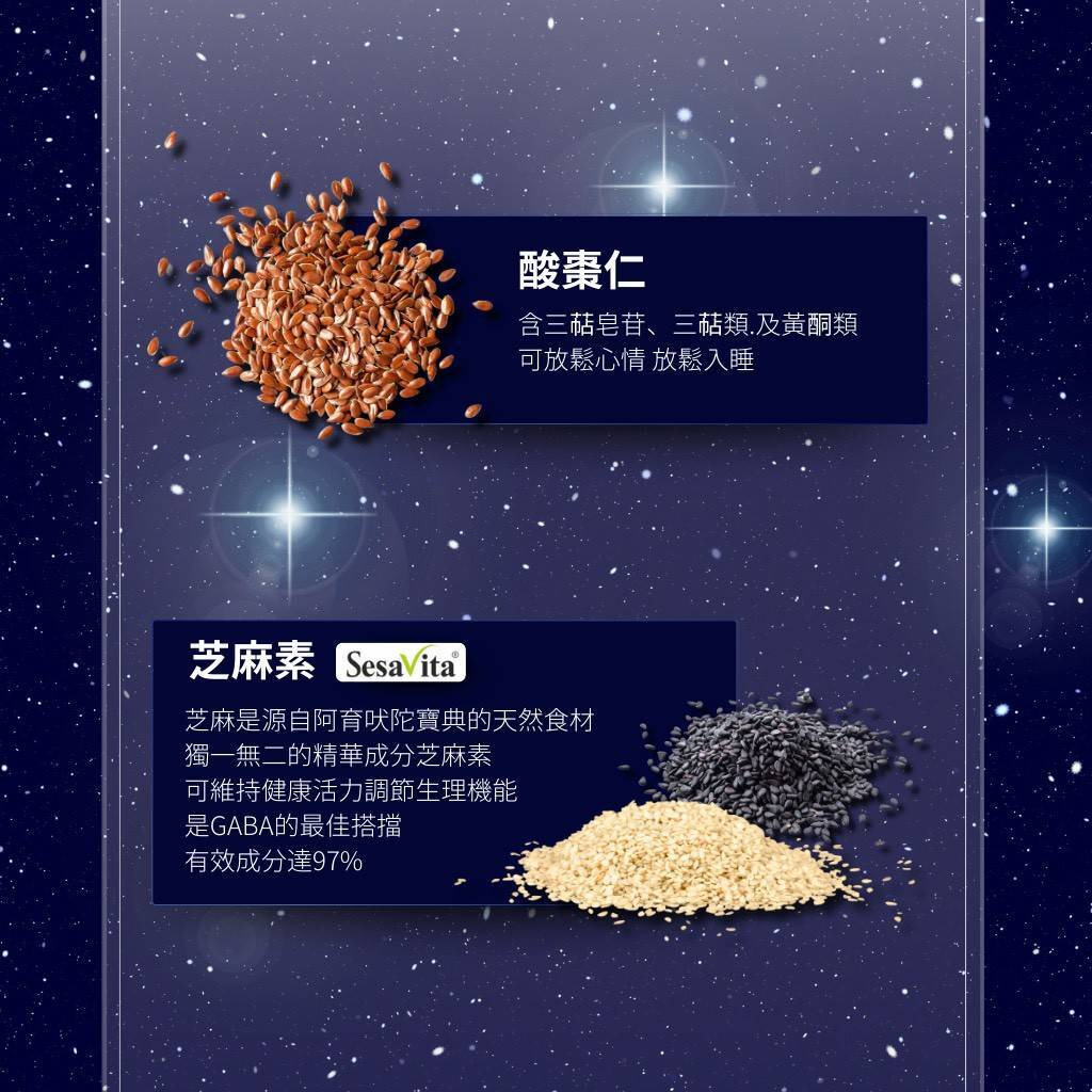 • 內容物:L-色胺酸、專利 GABA、芝麻素、γ-穀維素、酸棗仁萃取物、黑胡椒萃取物、麥芽糊精