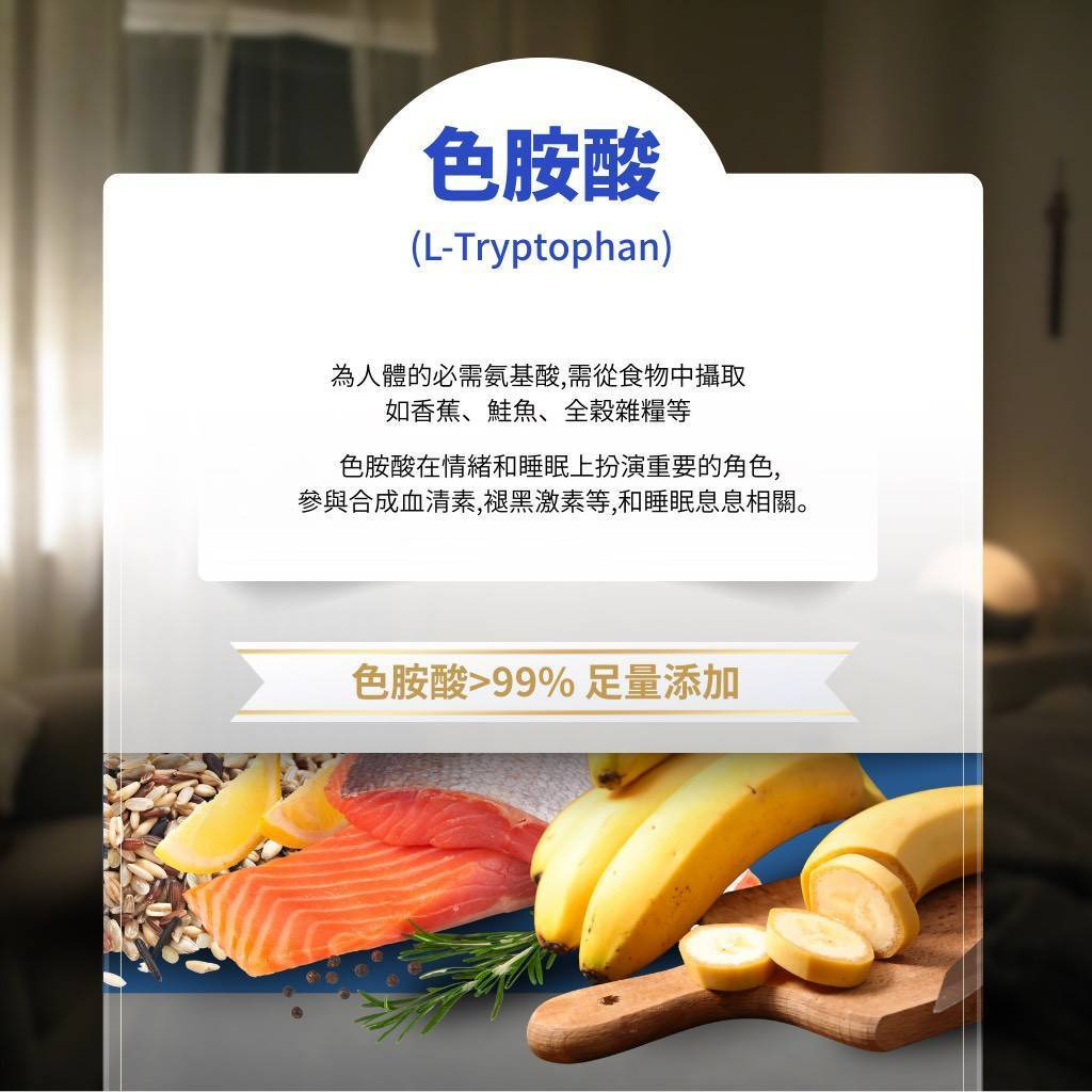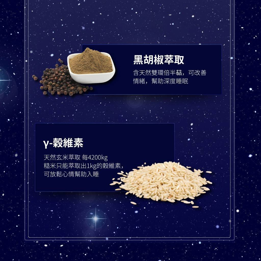 • 專利配方:L-色胺酸 + 專利 GABA + 芝麻素 + γ-穀維素 + 酸棗仁 + 黑胡椒