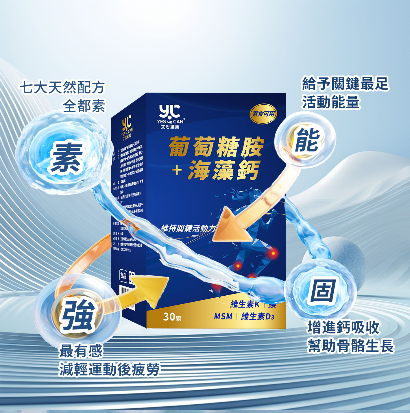 👉 含海藻鈣、葡萄糖胺、MSM、玻尿酸、鎂、D3、K2,全面強化骨骼及關鍵靈活度。