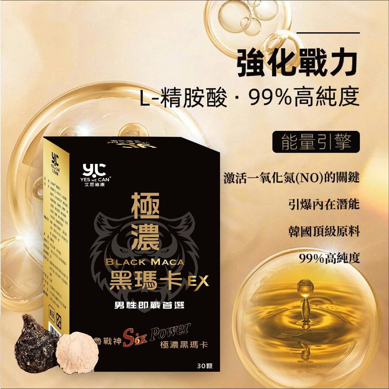 • 威猛戰力來源:體內一氧化氮(NO)的前驅物,提升男性活力。