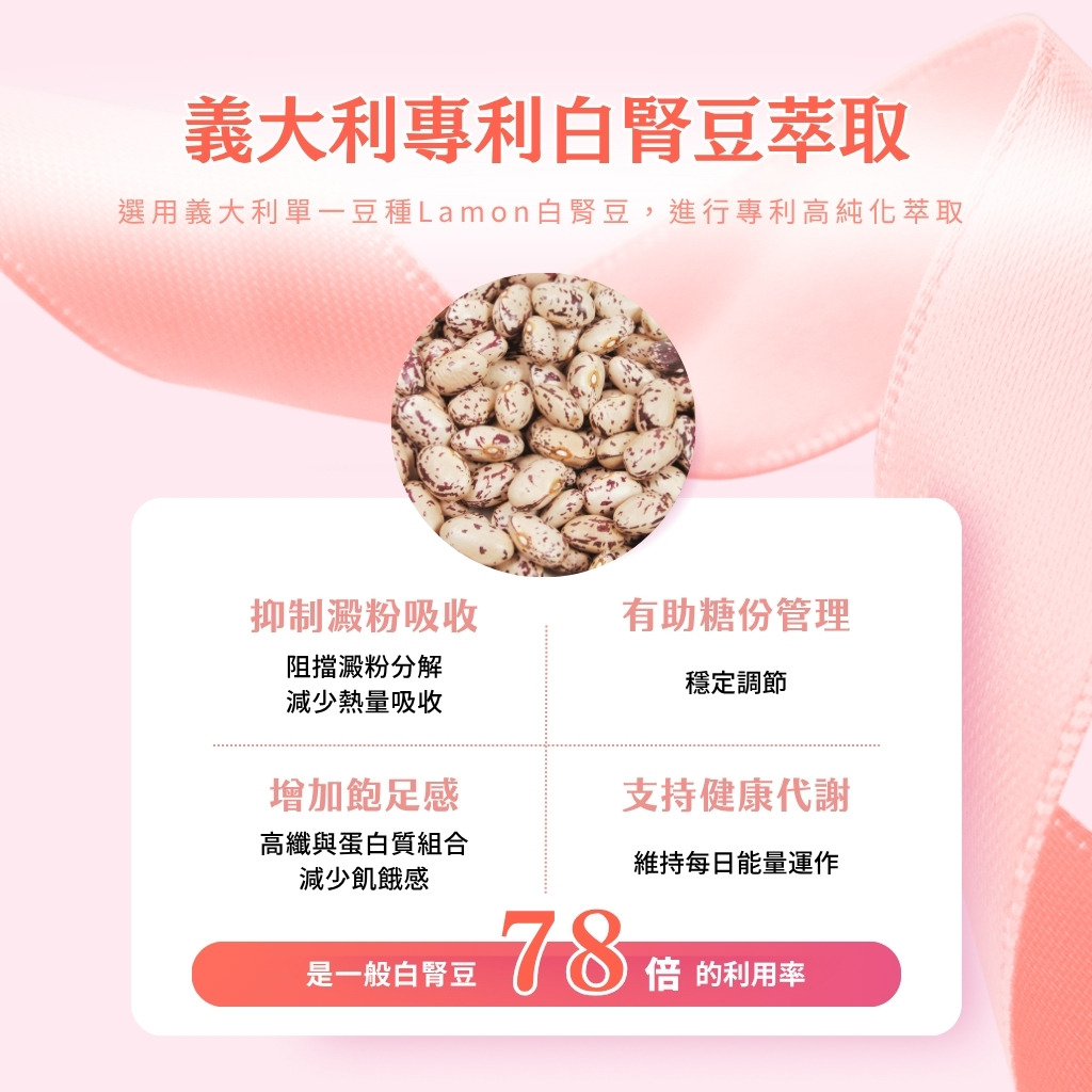 • 選用義大利單一豆種 Lamom 白腎豆,經百年大廠專利高純化萃取。